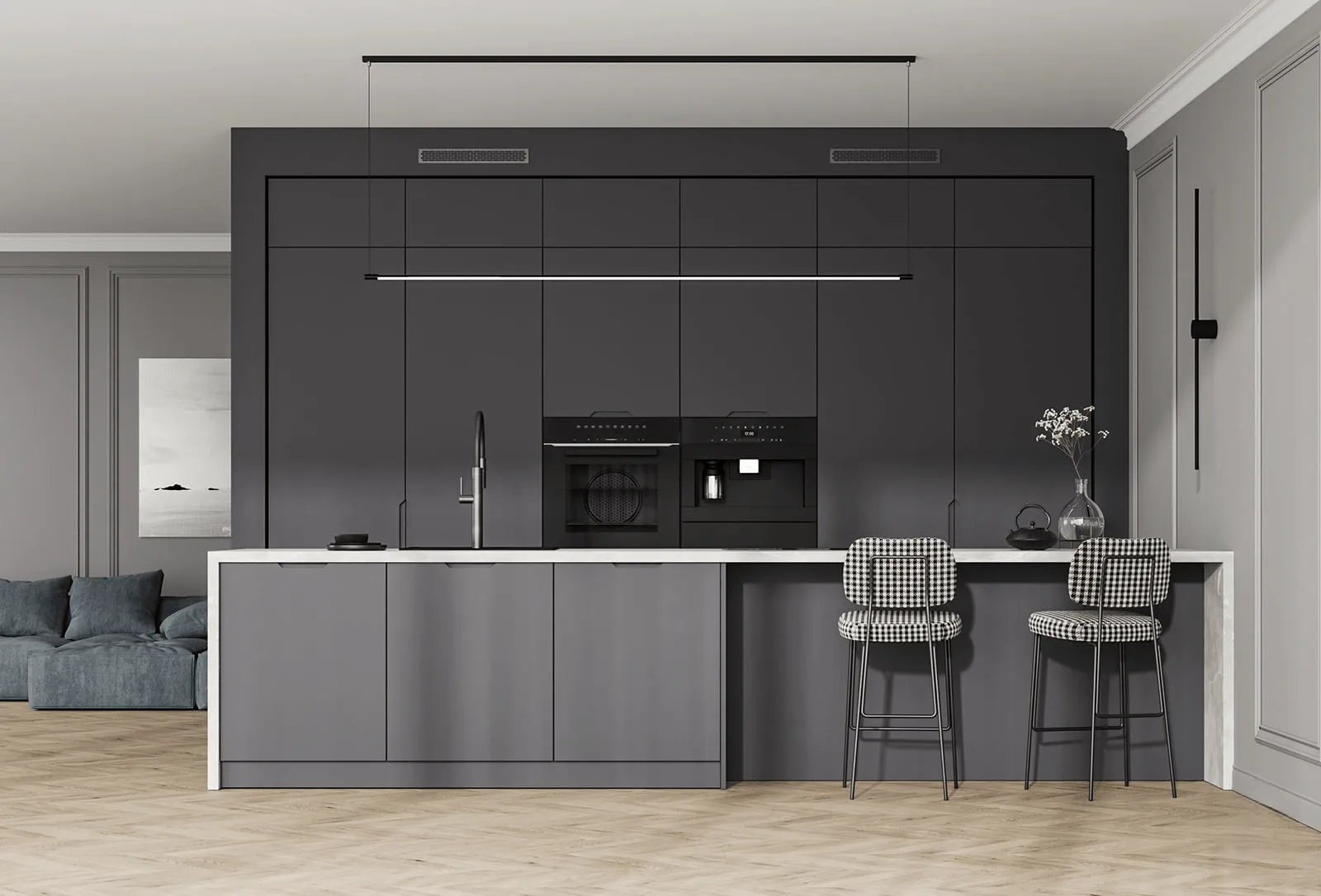 Кухня АЗУР создает атмосферу свободу стиля ЛОФТ, совмещая в себе функциональность и изысканность. Темные фасады кухонных шкафов, изготовленные из МДФ и окутанные Эмалью, придают помещению особую нотку шика и роскоши. Они не только выглядят изысканно, но и идеально вписываются в современные тренды дизайна интерьера. Такой выбор цвета придает кухне современный вид, избавляя ее от обыденности и обычного подхода