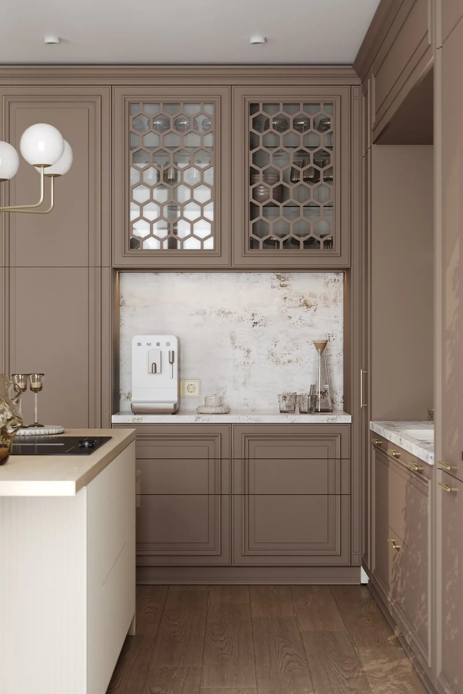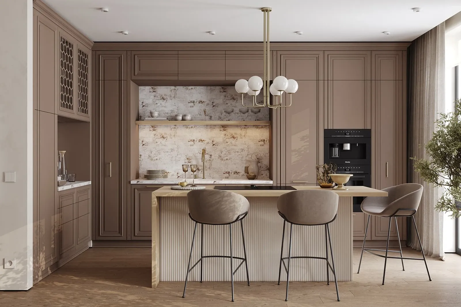 Фасады: Т654 Крашеная МДФ, цвет NCS S 5010-Y70R Матовый / Т646 Крашеная МДФ, цвет NCS S 0500-N Матовый
