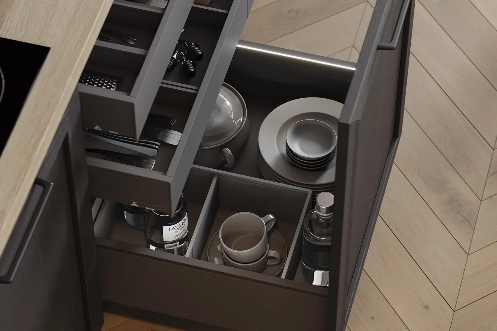 Система выдвижения: LEGRABOX, цвет Серый Орион Матовый; профиль с акцентной подсветкой
